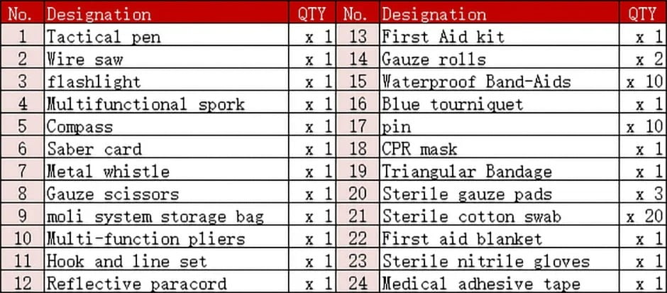 [First Aid Kit]: Designed to stow conspicuously, the included first aid supplies are packed in an extra bright red bag. It includes essential items such as pliers, scissors and pins, wound pad, bandage triangularine, tourniquet, cotton buds, a generous supply of bandages etc. Perfect for taking care of medical or emergency needs during outdoor wilderness adventures or disasters.