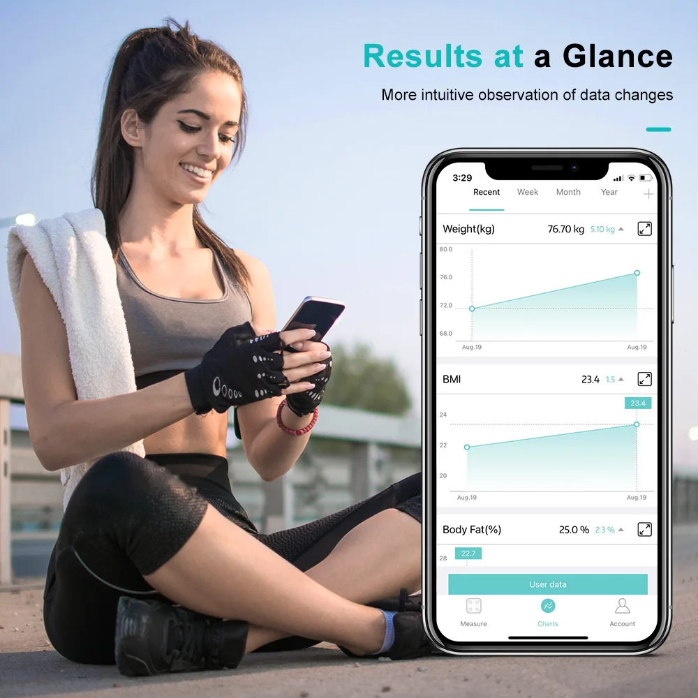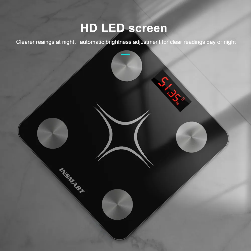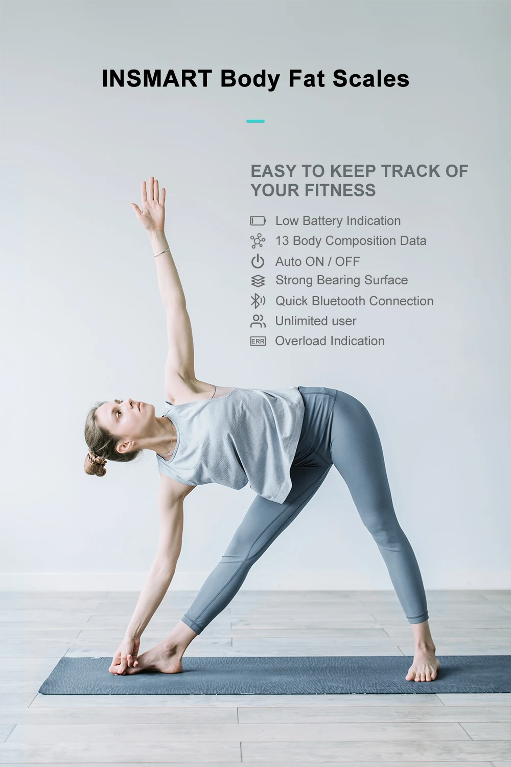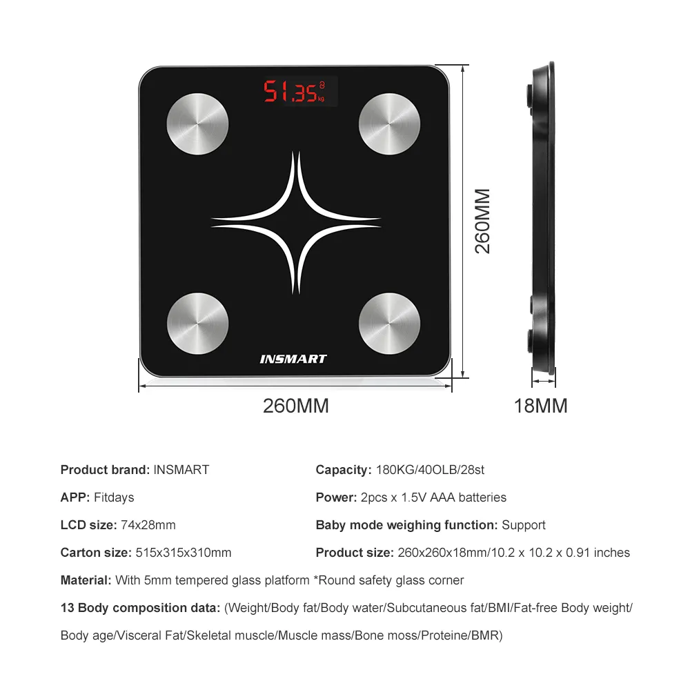 - Analyzes 13 essential body data, including Weight, BMI, Body Fat, Fat-free Body Weight, Subcutaneous Fat, Visceral Fat, Body Water, Skeletal Muscle, Muscle Mass, Bone Mass, Protein, BMR, and Metabolic Age.